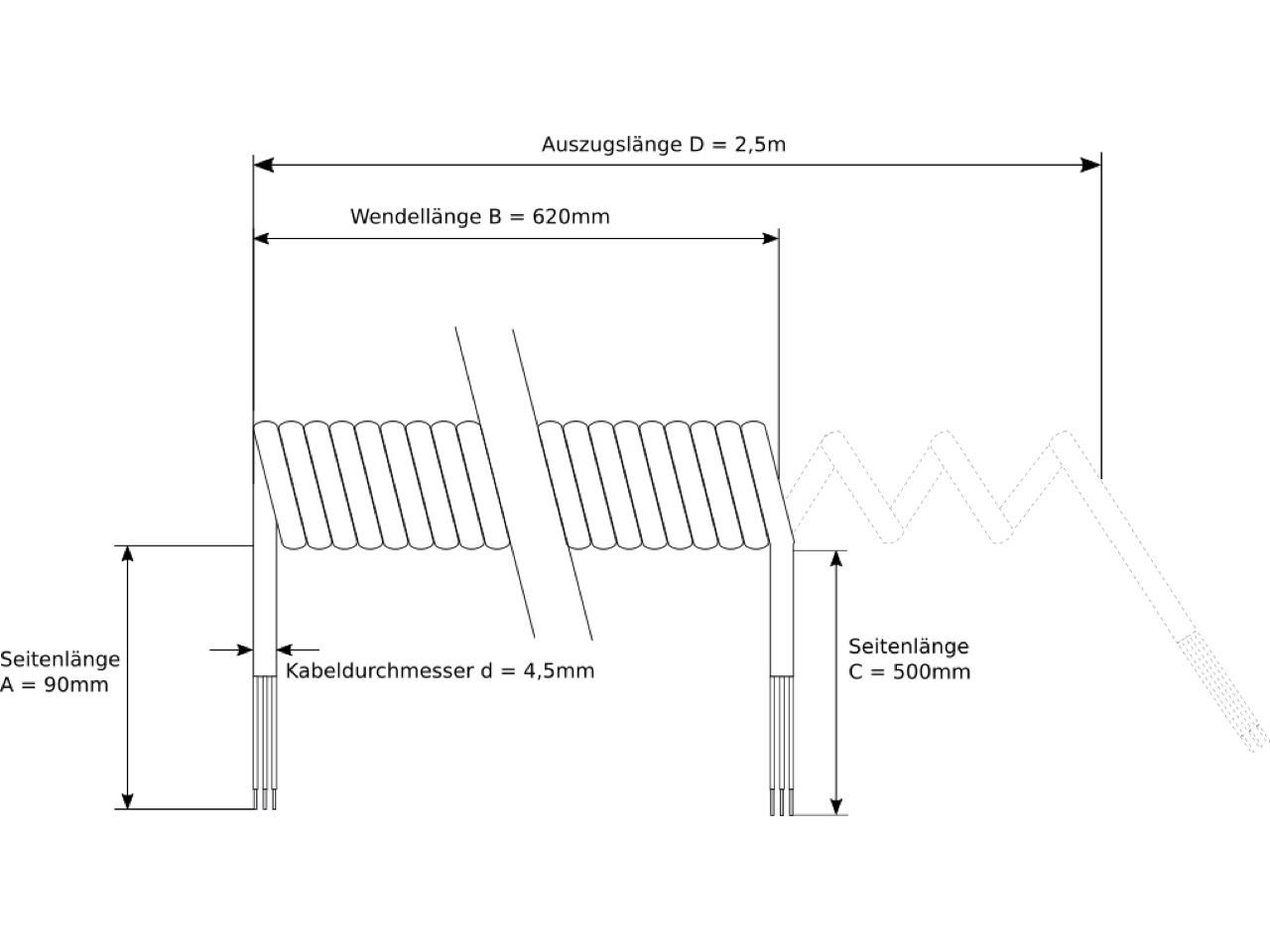 Coil cord for doors, PUR/ PUR, black, cable configuration: fine-stranded 3x0,25mm², Li11Y11Y, dimensions: left end = 90mm, coil length = 620mm, right end = 500mm, max. extension length 2,5m