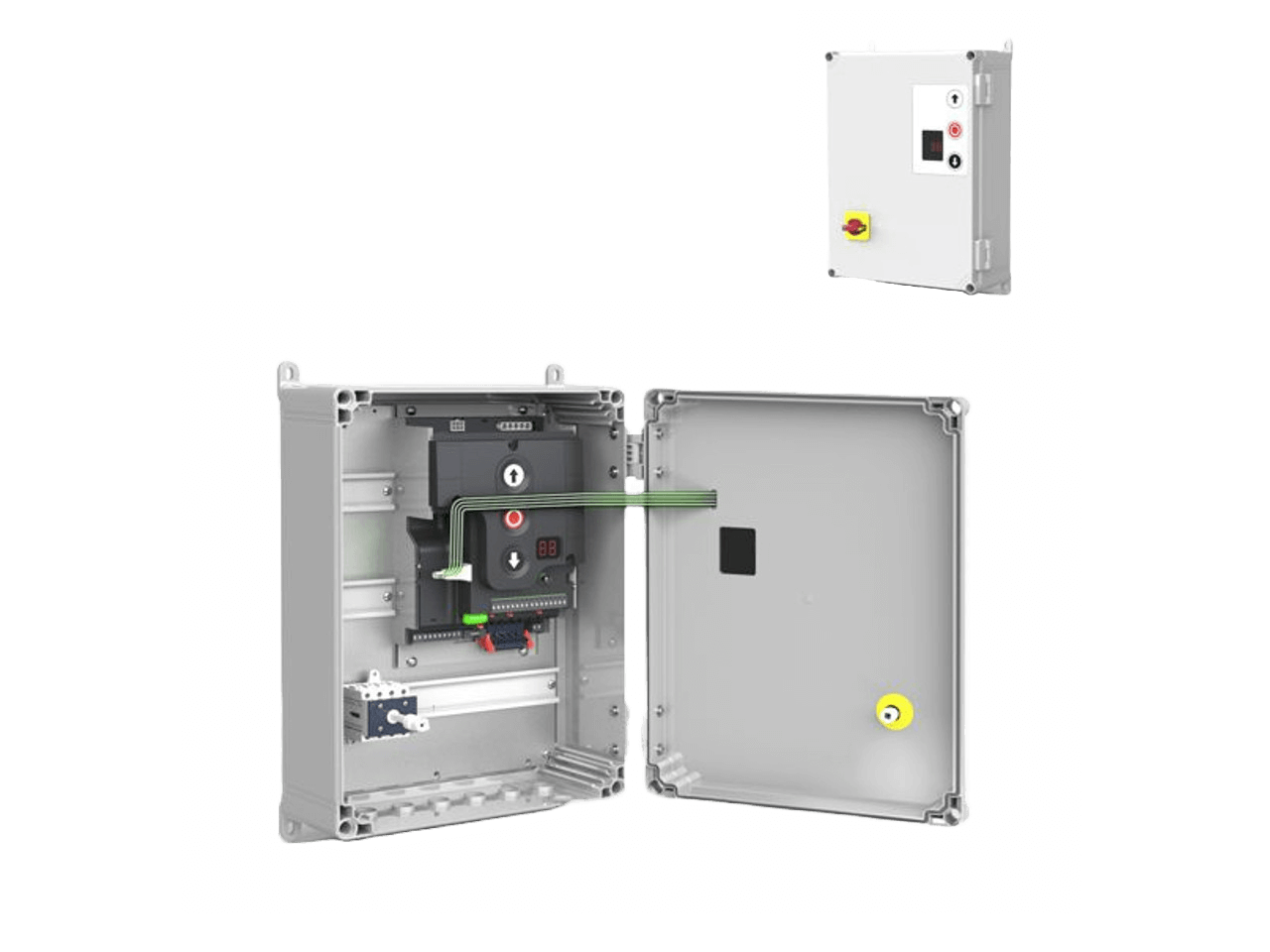 Door control unit for GfA Elektromaten drives with digital or mechanical limit switch, automatic or constant pressure to close operation, with integrated radio system, in XL plastic housing, with mains switch 3N~400V built into the lid